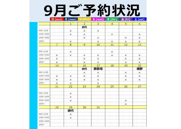 いつもご利用ありがとうございます。 まだまだ暑い日が続いておりますが皆様いかがお過ごしでしょうか? 9月後半スケジュールをUPしました。 お問い合わせお待ちしております。